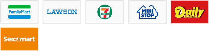 ファミリーマート、ローソン、セブンイレブン、ミニストップ、デイリーヤマザキ、セイコーマートがご利用いただけます。